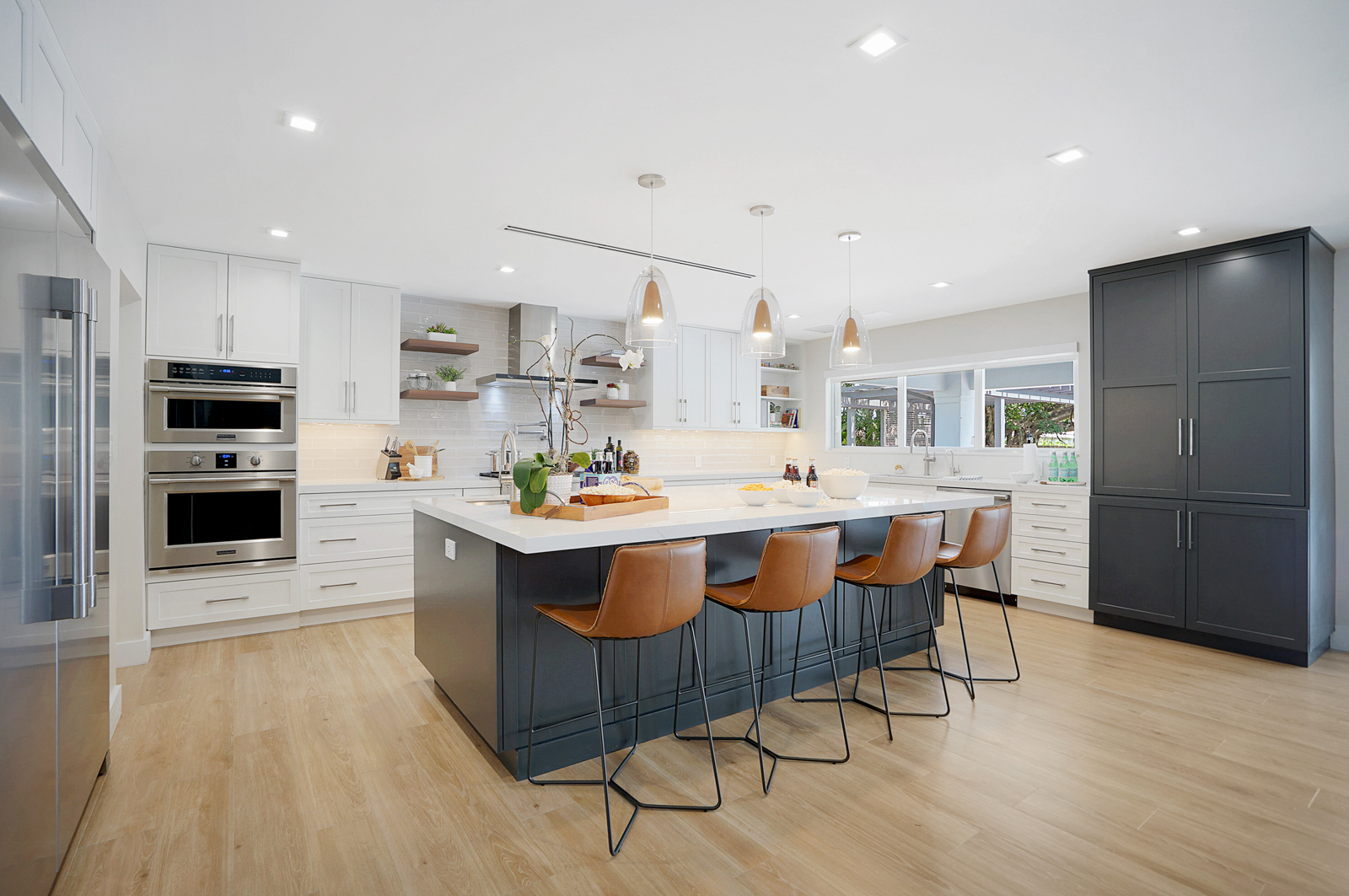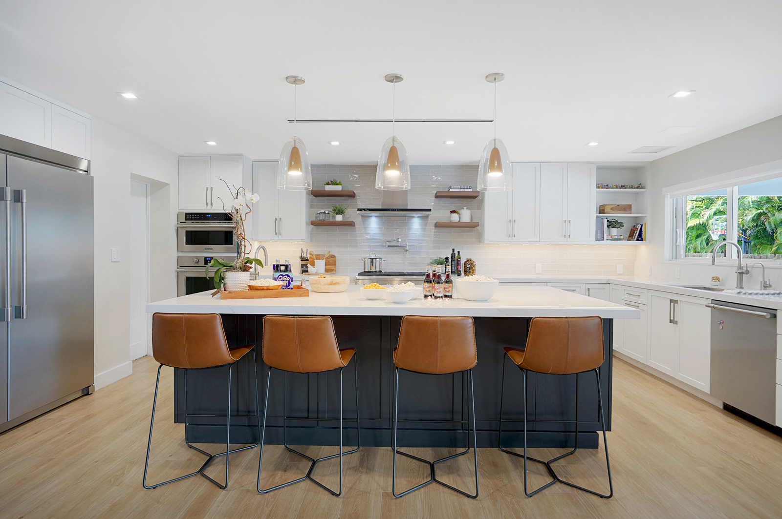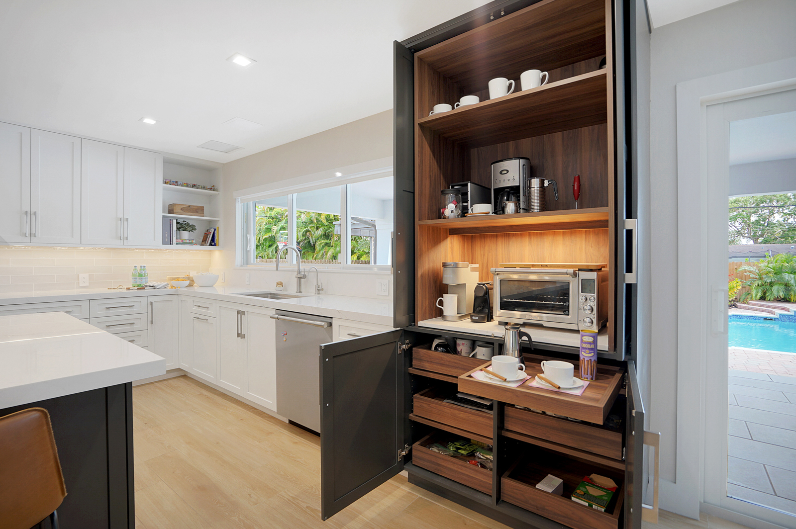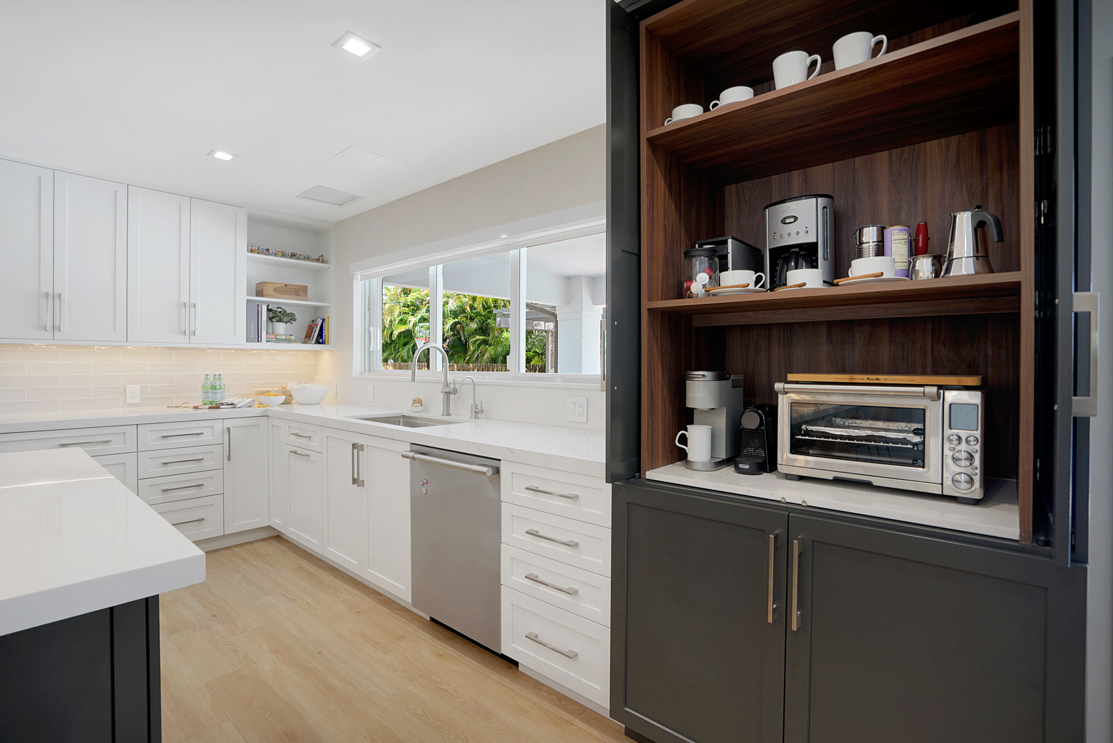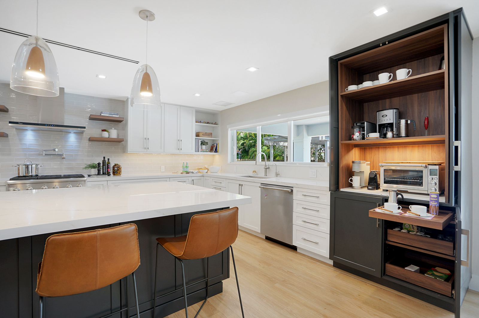 We chose a white painted shaker cabinet with a little twist. The perimeter of the kitchen has white cabinets, then we added walnut open shelves on each side of the hood and splashed the island and appliance center with a cyberspace blue (not blue-blue or a black-black but a perfect combination of each…Ahhhhh). Just take a moment to look at the appliance center/coffee bar designed with walnut and cyberspace. Soooo amazing I can’t EVEN tell you how happy my clients are with how it turned out. This appliance center is equivalent to being the most popular kid in school! Yes, it is THAT good.